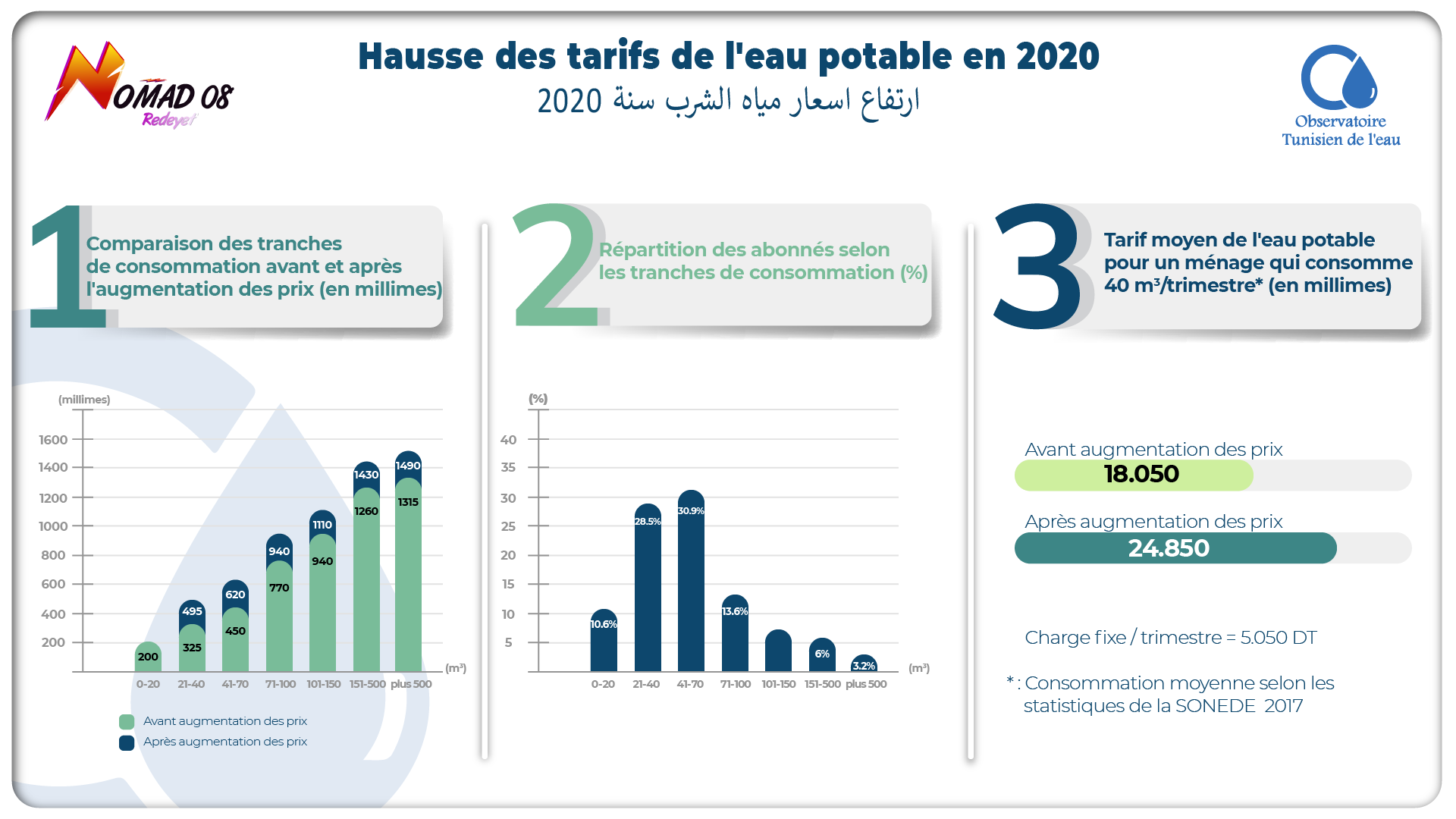 يدحض هذا الرسم البياني تبريرات الحكومة، إن وجدت أصلا، التي تسعى حسب قولها للحدّ من التبذير و محاولة تغطية كلفة إنتاج المياه و غيرها من المصطلحات، و كونها لم تستهدف إلّا كبار المستهلكين و المبذّرين من المشتركين بالشبكة. حيث تعاملت بمنطق الغنيمة مع شريحة تمثّل 70 % من مجموع المشتركين يالشبكة (الإستهلاك لا يتجاوز 70 م3 في الثلاثية)، و يوضّح كذلك مدى تضرّر المواطن من حيث المبلغ الإضافي الملزم بدفعه بعد الزيادة الأخيرة.