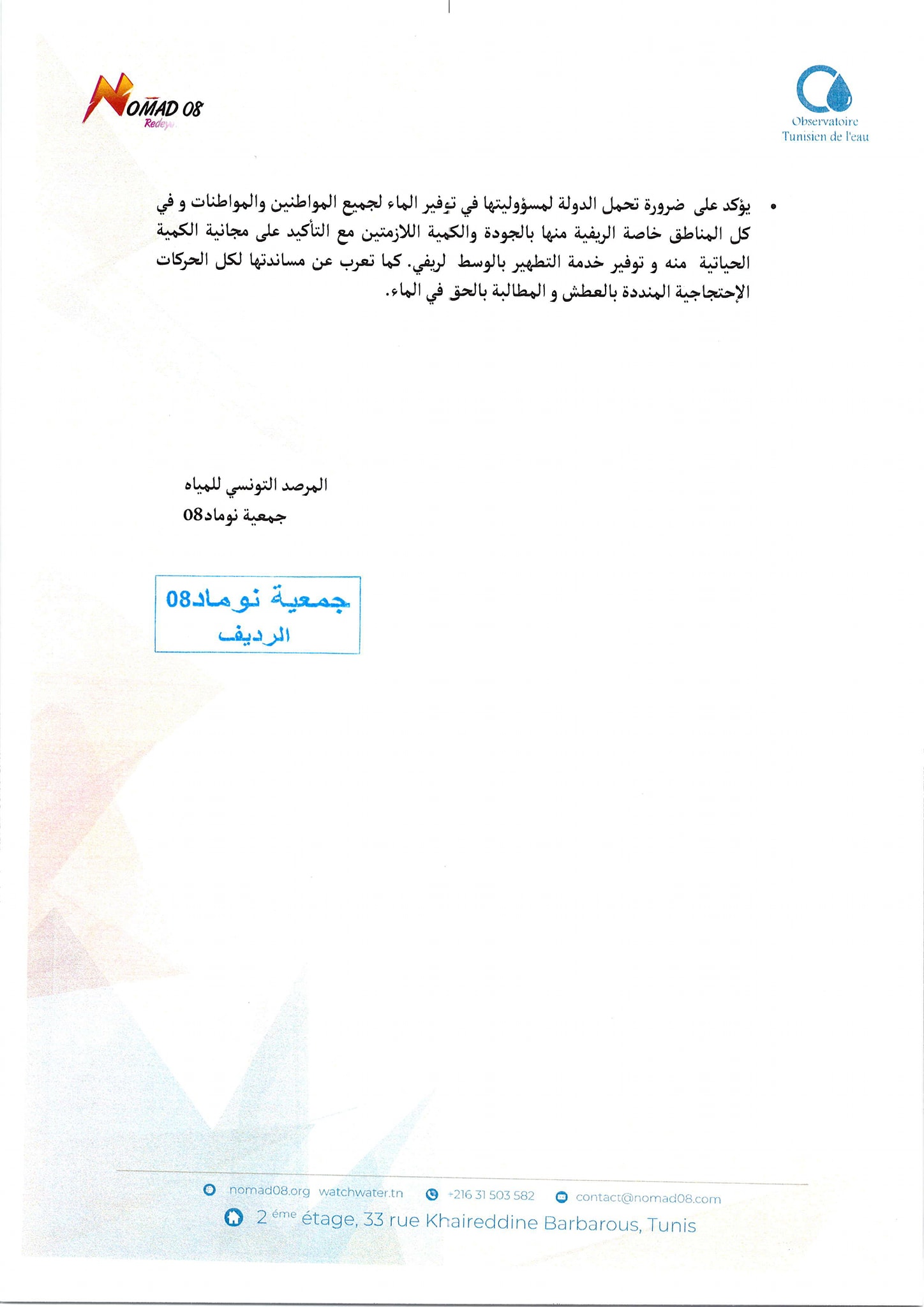 ️يدعو مجلس نواب الشعب الى تنقيح مشروع مجلة المياه قبل المصادقة عليها والحرص على عدم مخالفتها للمعاهدات التي أمضت عليها الدولة التونسية والتّقيد بمقتضيات الفصل 44 من الدستور و الإنصات لنداءات المجتمع المدني وتوصياته خاصة الداعي منها إلى التنصيص على القيمة الإجتماعية للموارد المائية وإعتماد البصمة المائية كآلية حوكمة للتصرف في الموارد المائية.