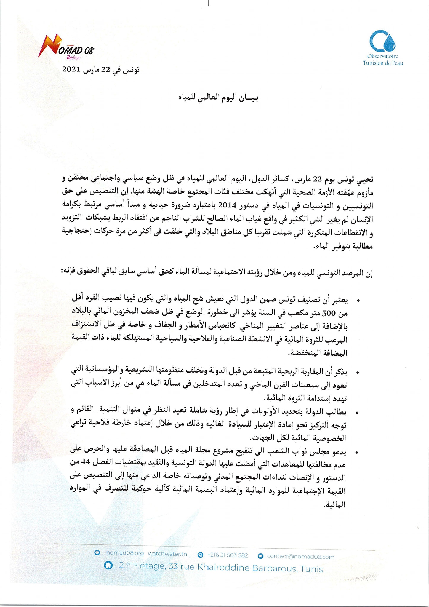تحيي تونس يوم 22 مارس، كسائر الدول، اليوم العالمي للمياه في ظل وضع سياسي واجتماعي محتقن و مأزوم عمّقته الأزمة الصحية التي أنهكت مختلف فئات المجتمع خاصة الهشة منها. إن التنصيص على حق التونسيين و التونسيات في المياه في دستور 2014 باعتباره ضرورة حياتية و مبدأ أساسي مرتبط بكرامة الإنسان لم يغير الشي الكثير في واقع غياب الماء الصالح للشراب الناجم عن افتقاد الربط بشبكات التزويد و الانقطاعات المتكررة التي شملت تقريبا كل مناطق البلاد والتي خلقت في أكثر من مرة حركات إحتجاجية مطالبة بتوفير #الماء.