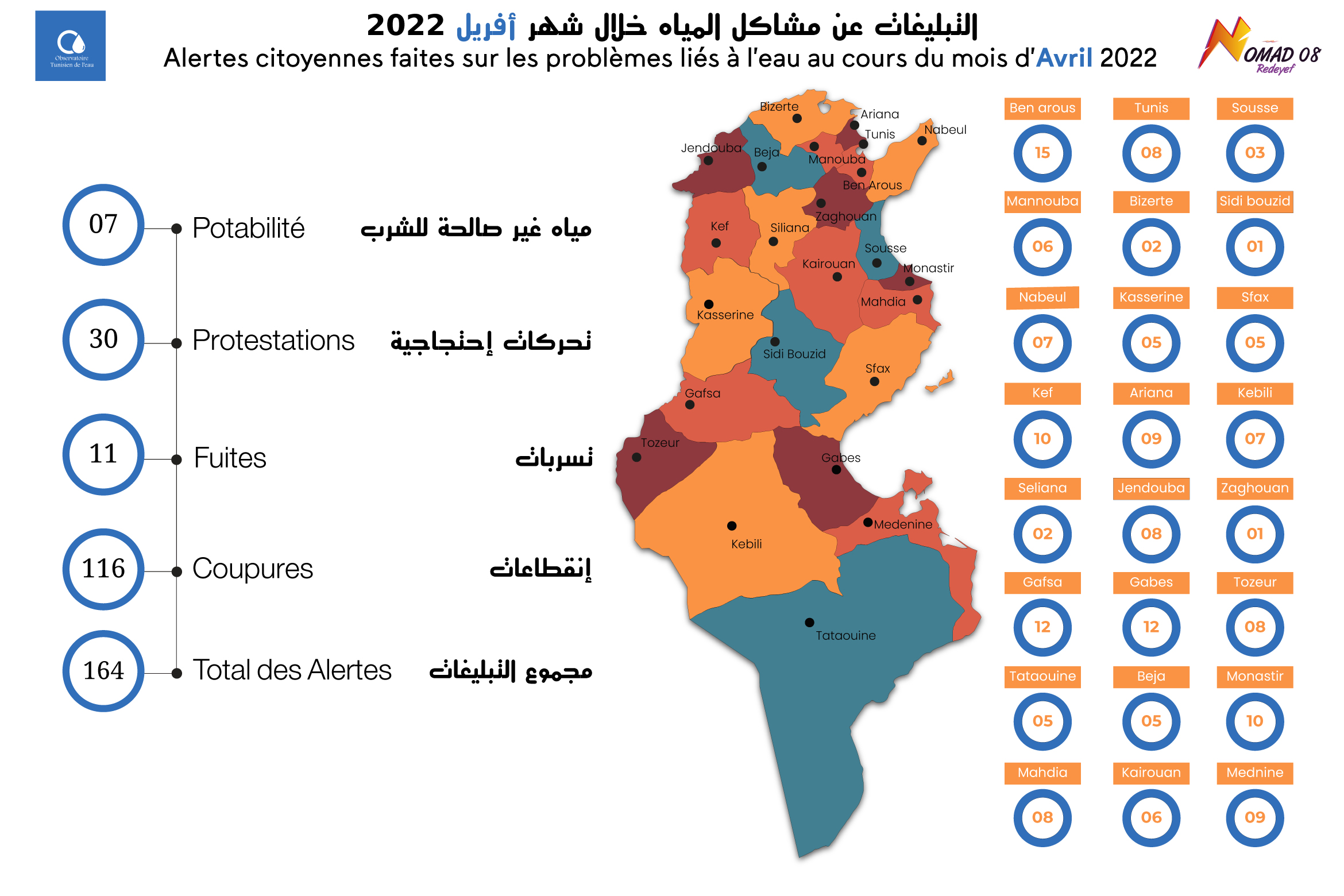حصيلة التبليغات الواردة على موقع المرصد التونسي للمياه لشهر أفريل 2022