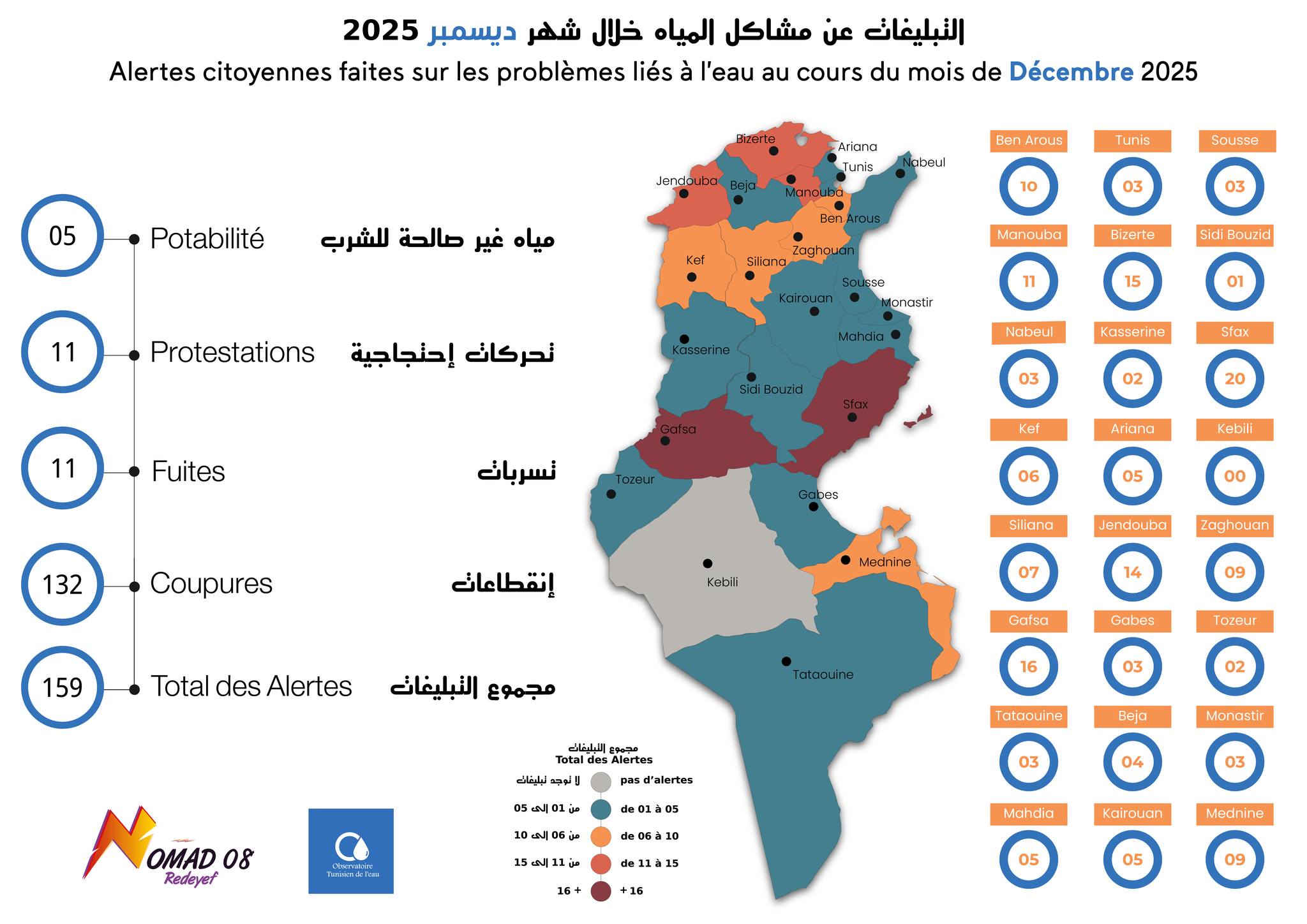 Le nombre total des alertes reçues sur le site de l'Observatoire Tunisien de l'Eau www.watchwater.tn pour le mois de Décembre a atteint 159 alerts citoyens concernant un problème lié au droit à l'eau.