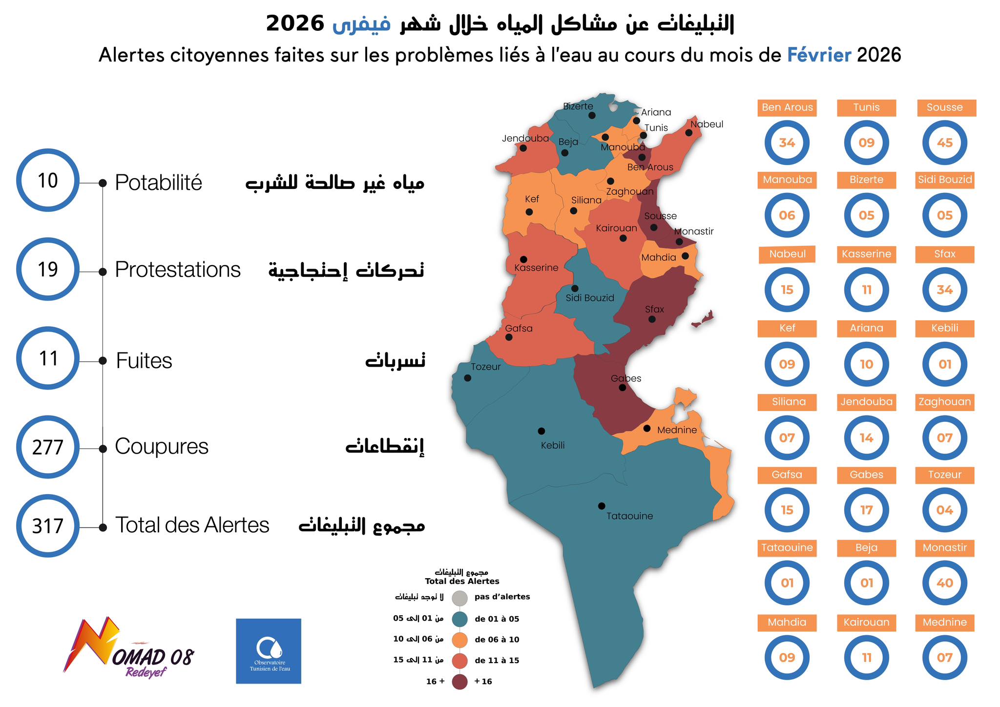 Le nombre total des alertes reçues sur le site de l'Observatoire Tunisien de l'Eau www.watchwater.tn pour le mois de Février a atteint 317 alerts citoyens concernant un problème lié au droit à l'eau.